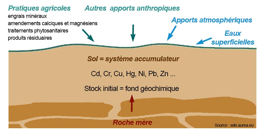 Concernant les sols agricoles, les flux varient en fonction du type et de l’origine (cf. graphique ci-dessous). Ainsi, les traitements phytosanitaires apportent principalement du cuivre (Cu). Celui-ci est utilisé en antifongique, par exemple sous forme de bouillie bordelaise.